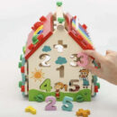 Zabawka wykonana jest z drewna i plastiku, wielokolorowa i przyjazna dla dziecięcych rączek. Domek jest częściowo samodzielny w montażu — dziecko może pomóc w składaniu, co dodatkowo angażuje i uczy. Wymiary orientacyjne: 22 x 19 x 24 cm, waga ok. 1,3 kg.