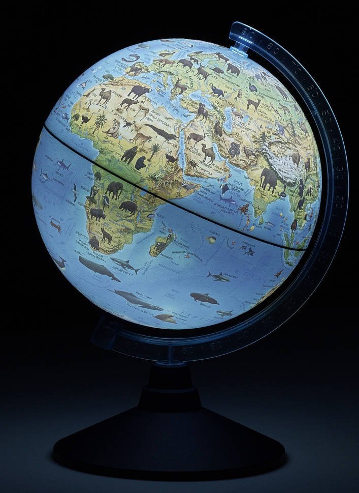 Globus Alaysky ma 25 cm średnicy — idealny, by trzymać go pod ręką, ale też wystawić w pokoju i powiedzieć: „Tu mieszka lew, tu pingwin, a tam żółw morski!”.