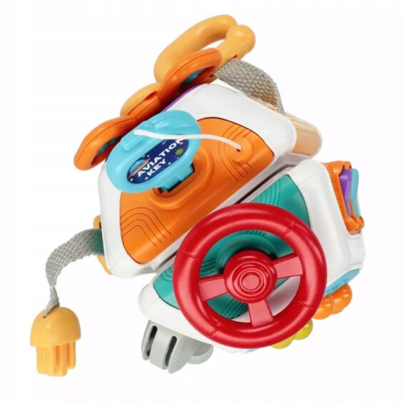 Każda ściana kostki to nowe wyzwanie – guziki do naciskania, tekstury do eksploracji, obracające się elementy, suwak i inne – wszystko po to, by maluch mógł badać świat wszystkimi zmysłami 🌀 Wspólna zabawa z kostką wspiera komunikację, cierpliwość i kreatywne podejście do rozwiązywania prostych zagadek 💡