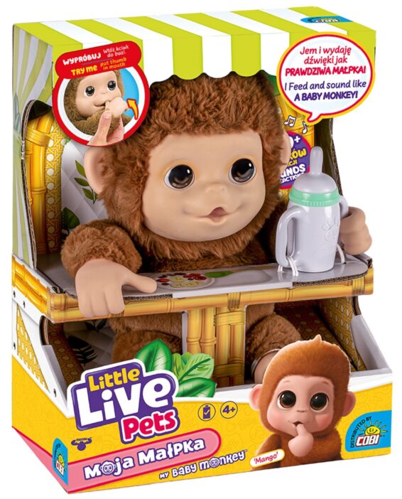 🐵Zestaw „Mango” to interaktywna małpka, która reaguje na dotyk, wydaje ponad 50 dźwięków i reakcji, a przy tym wygląda czarująco: ma „małpie” uszy, ruchome usteczka, i dłonie-łapki, którymi może się łapać i wieszać — tak jak prawdziwa małpka.